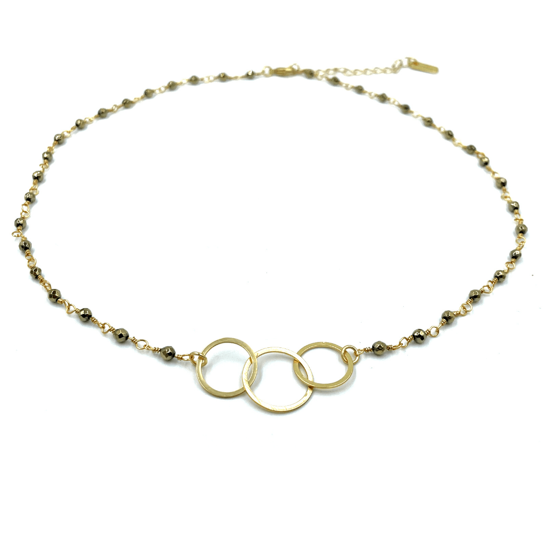 An every day favorite! Small, faceted pyrite beads with 3 gold over sterling rings. Gold over sterling silver chain. Casual or elegant. 16-18 inches.