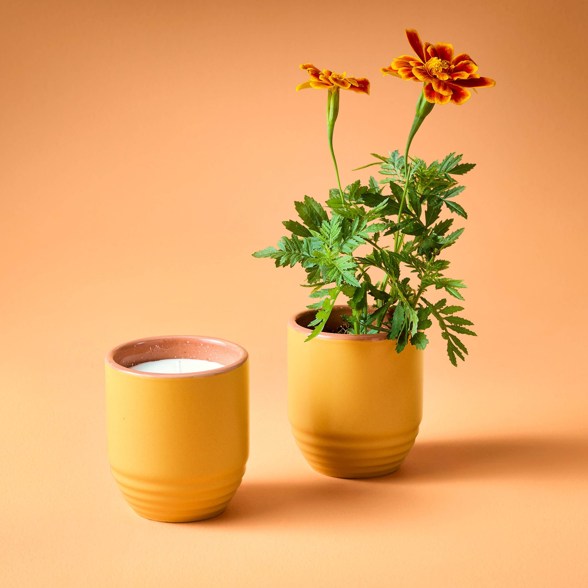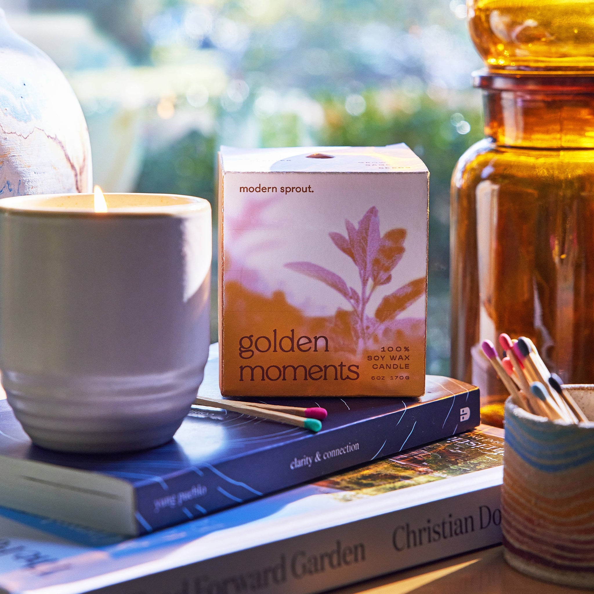 This 6oz, soy candle combines a scent and story that capture snapshots in time, inspired by our connection to nature. As it burns, it reveals a fun, flecked glossy interior. The vessel transforms into a planter and comes with seeds for aromatic plants, continuing the story beyond the flame. - Golden Moments: Sage Seeds; Scent Notes: Spanish Sage, Cali Lemon, Amber, Moss Attractive, handcrafted ceramic vessel with reactive glaze - Includes: - 6 oz. Scented Soy Candle - Non-GMO Seed Packet - Ceramic vessel with matte glaze exterior, flecked glossy interior - Soil not included - Beautiful holiday gift.